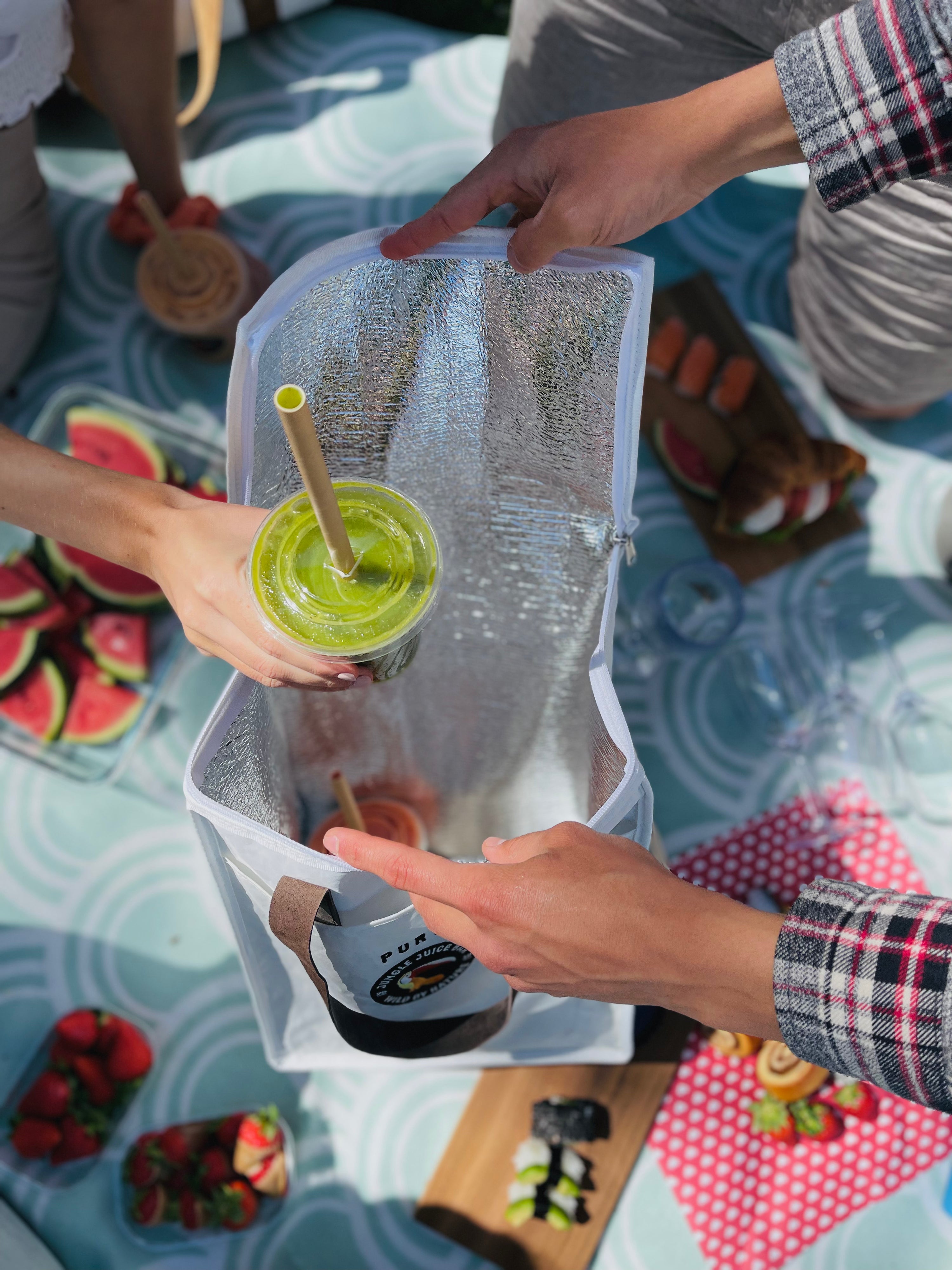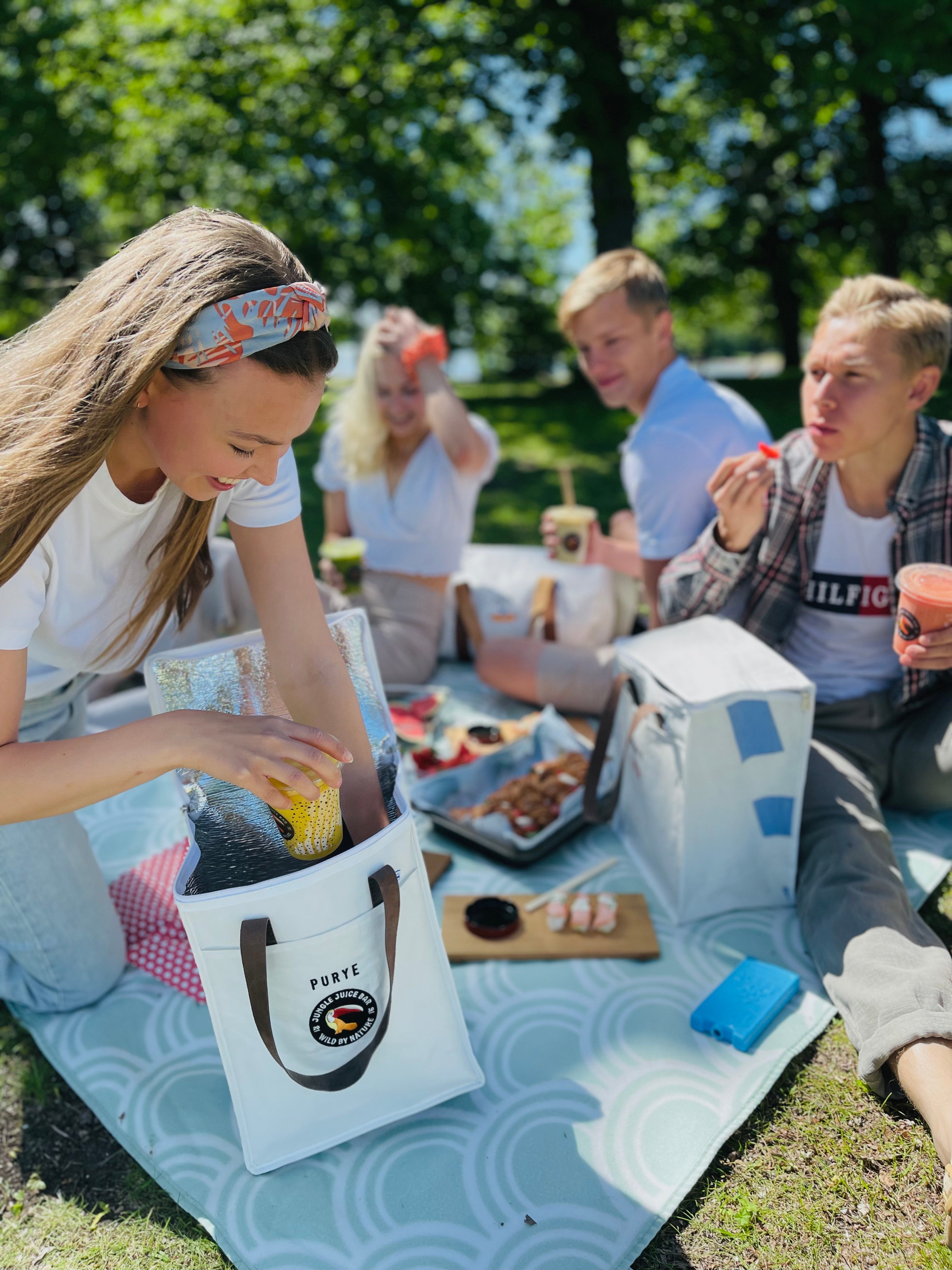 We organized a photoshoot with friends in the summer in Ruissalo. We also reached out to Jungle Juice Bar, and they assisted us with the product photography. What could be a better combo than refreshing fruit smoothies paired with a trendy cooler?