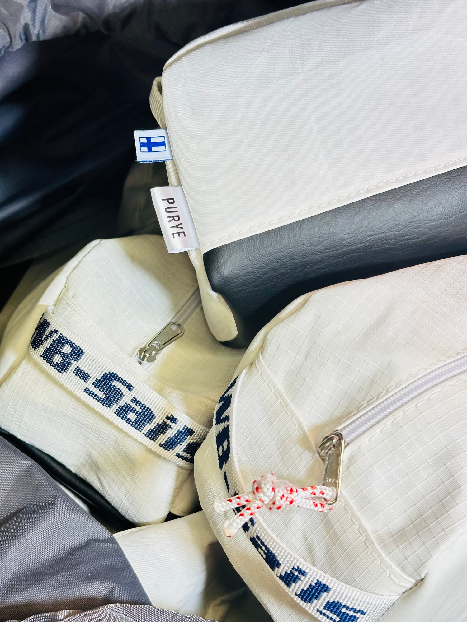 Saimme tilaisuuden yhteistyöhön purjeneulomo WB-Sailsin kanssa oman toilettilaukkumallin suunnittelussa. Tuotteissamme hyödynnetään WB-Sailsin vanhoja purjekankaita sekä muita kankaita neulomolta. Näitä ainutlaatuisia yhteistyötuotteita voi hankkia sekä meidän omasta verkkokaupastamme että WB-Sailsin myymälästä.