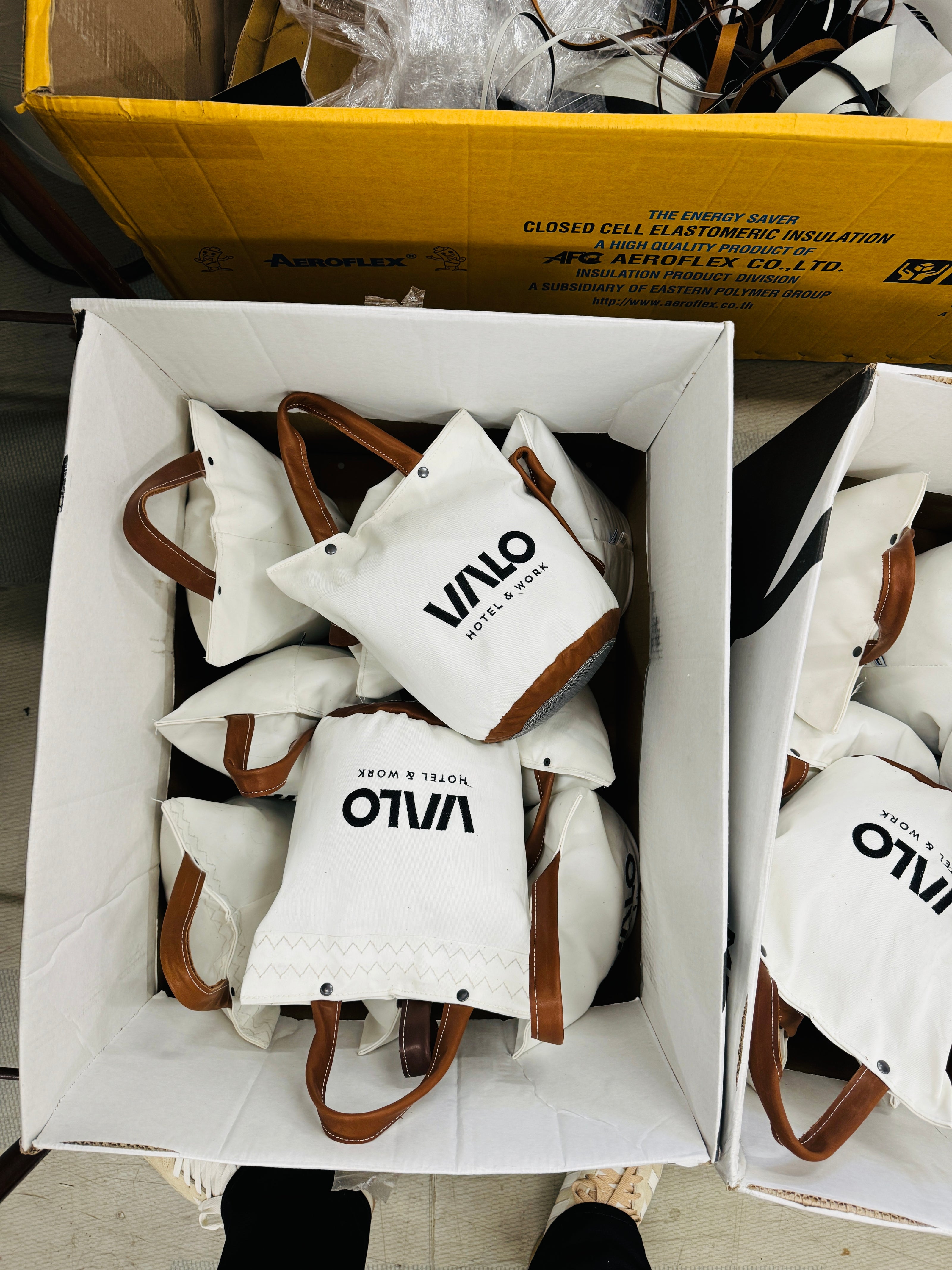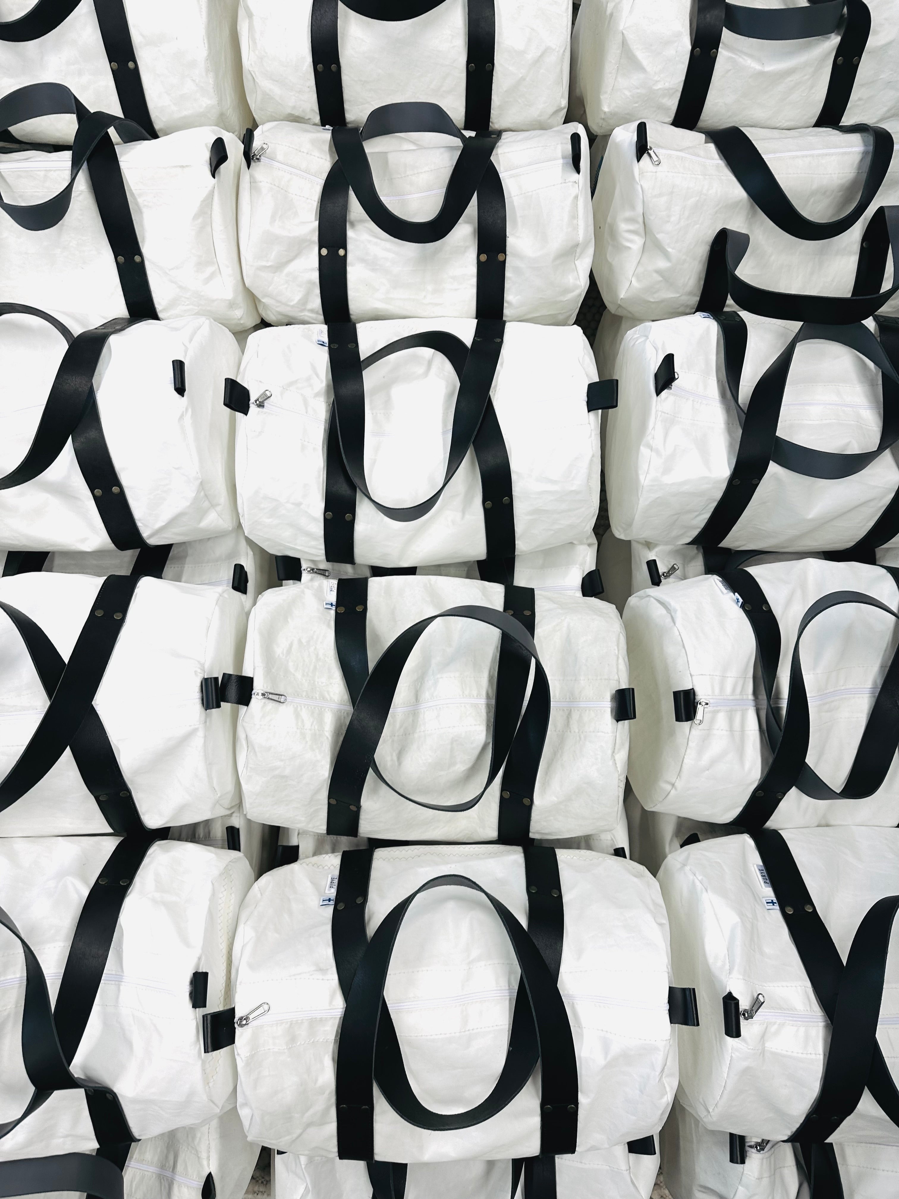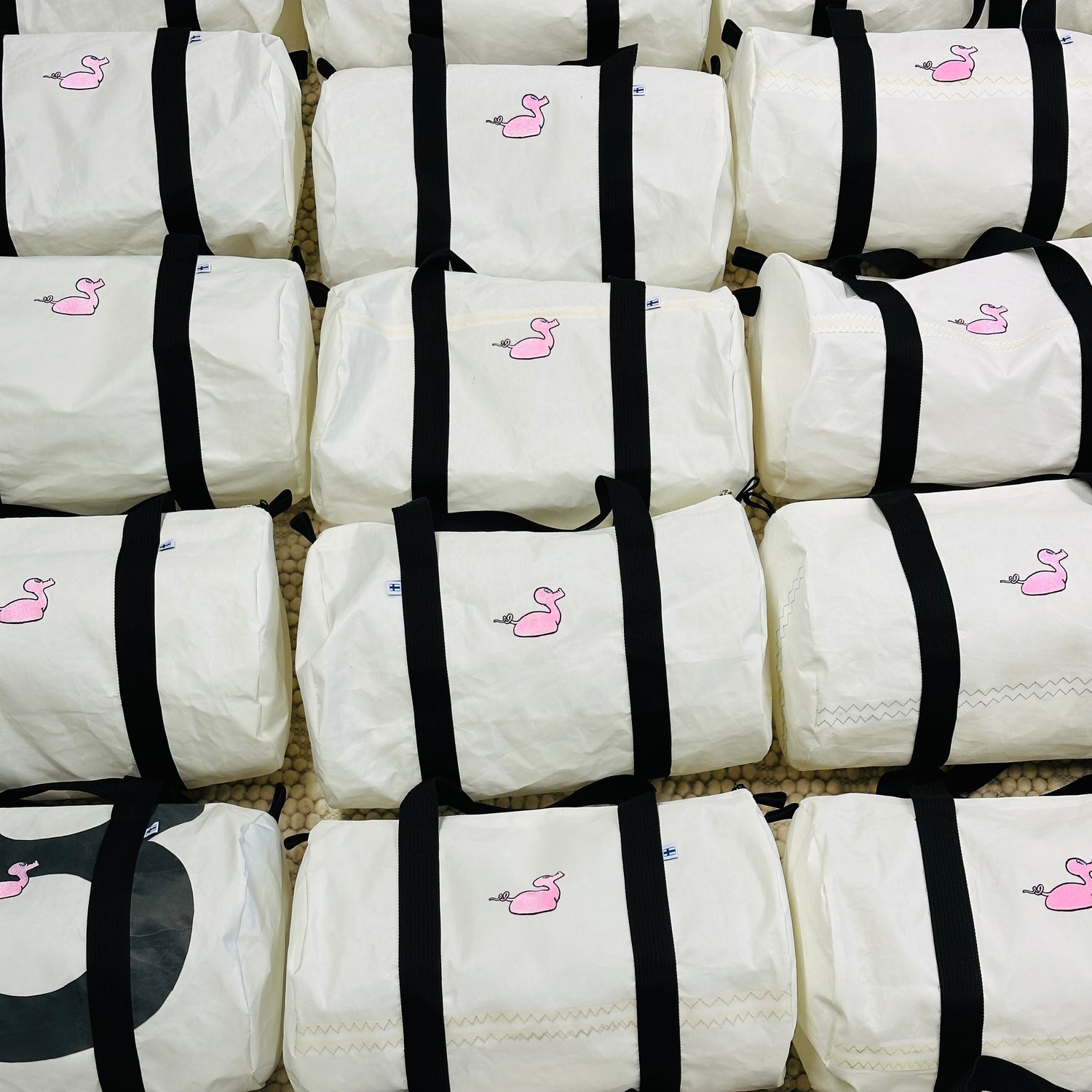Näissä tuotteissa hyödynsimme yli viisikymmentä neliömetriä vanhaa purjekangasta, joka muuten olisi päätynyt kaatopaikalle.