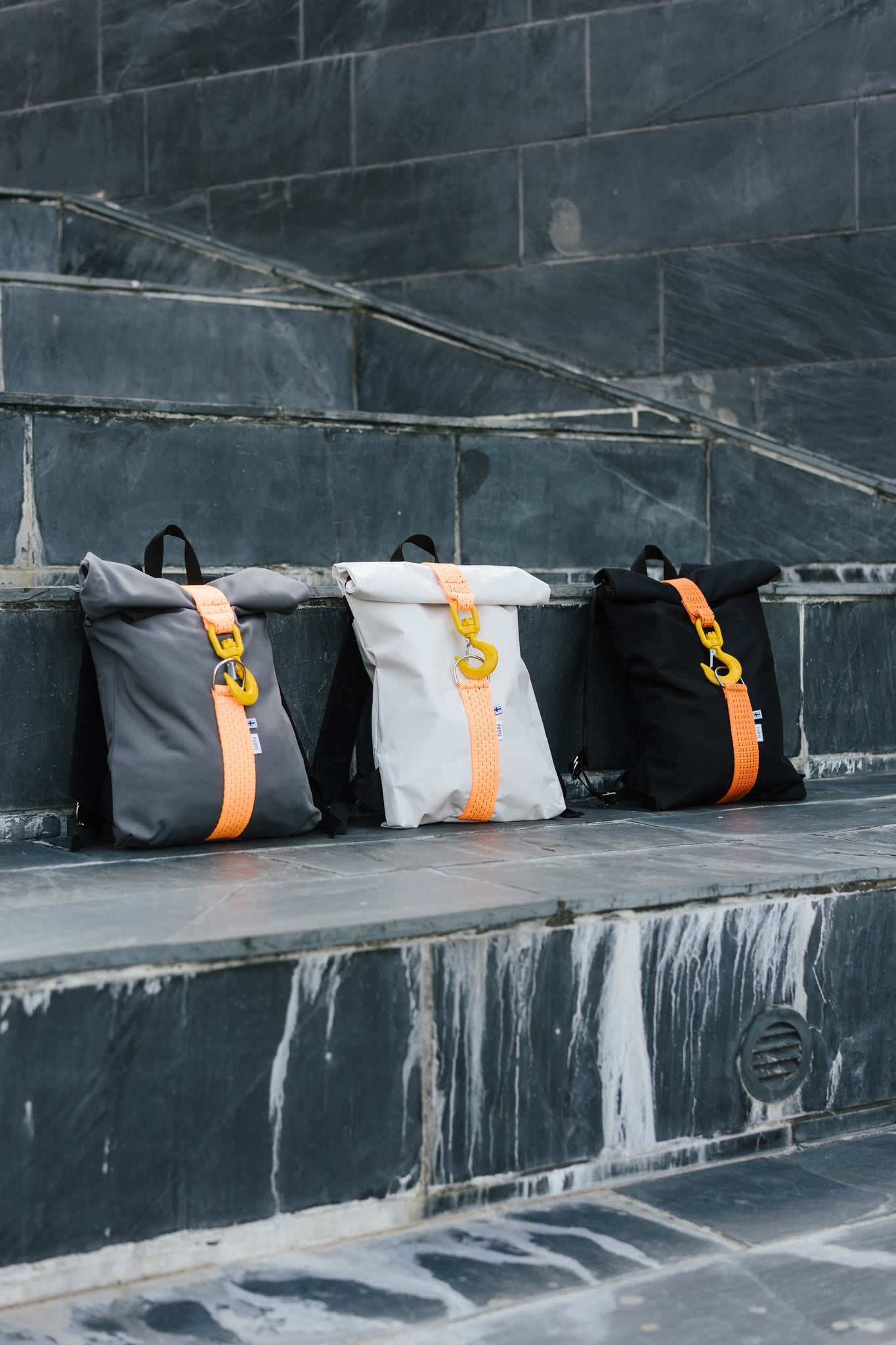 Ekologisesti kestävä valinta seikkailijoille. Valmistettu kestävästä hukka keinonahasta, joka ei ainoastaan kestä aurinkoa, kosteutta ja tulta, vaan kerää myös katseita rannalla! Laukun kantohihnana toimii kuormaliinoista saatu ylijäämä.